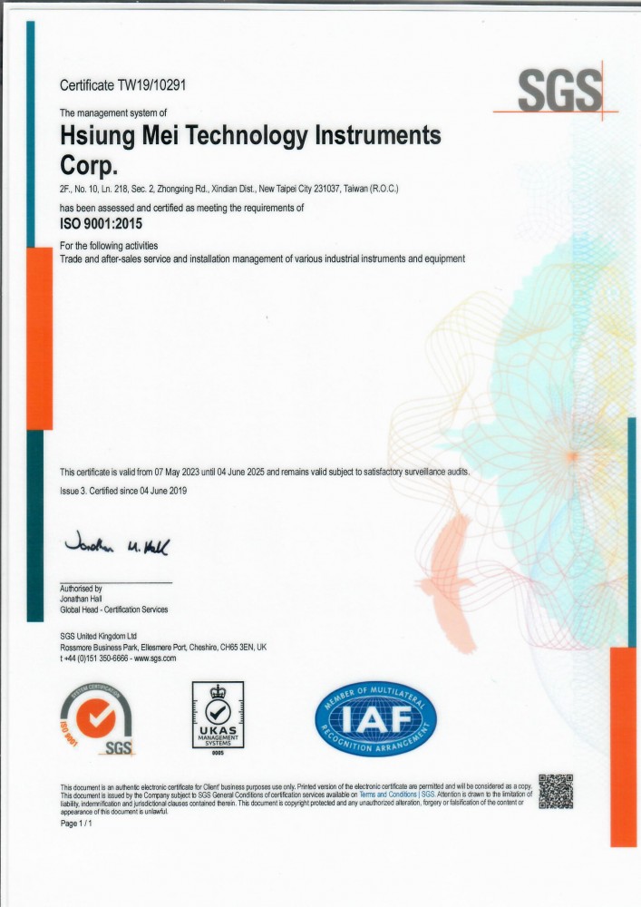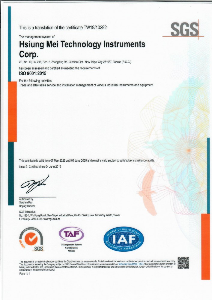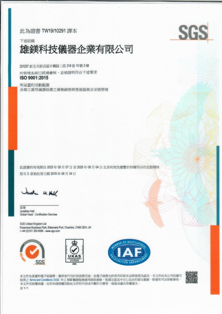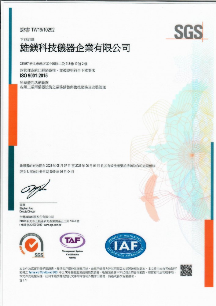 雄鎂科技通過 ISO 9001: 2015 各類工業用儀錶設備之業務銷售與售後服務及安裝管理的驗證